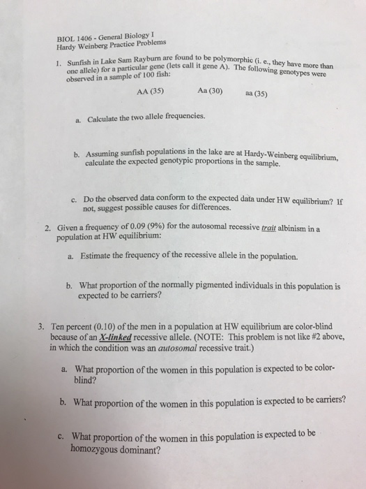 Hardy Weinberg Problem Set KEY from biologycorner.com Approximately what percent of the population are heterozygous carriers of the recessive pku allele? 36%, as given in the problem itself. Some or all of these types of forces all act on living populations at various times and evolution at some level occurs in all living organisms. View answers to practice hardy weinberg problems.pdf from biol 1b at california state university, chico. I really fail to understand. Therefore, the number of heterozygous individuals 3. The best answers are voted up and rise to the top. Follow up with other practice problems using human hardy weinberg problem set.